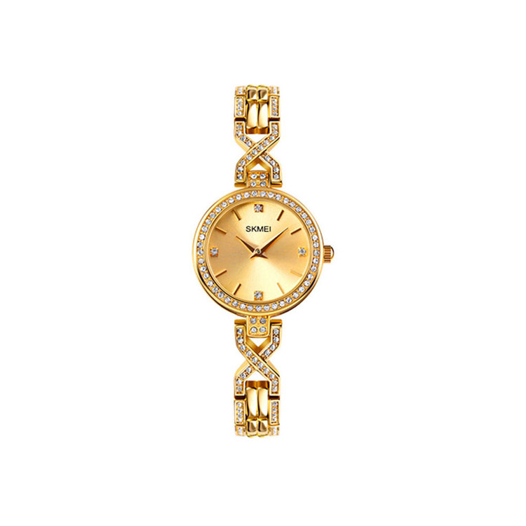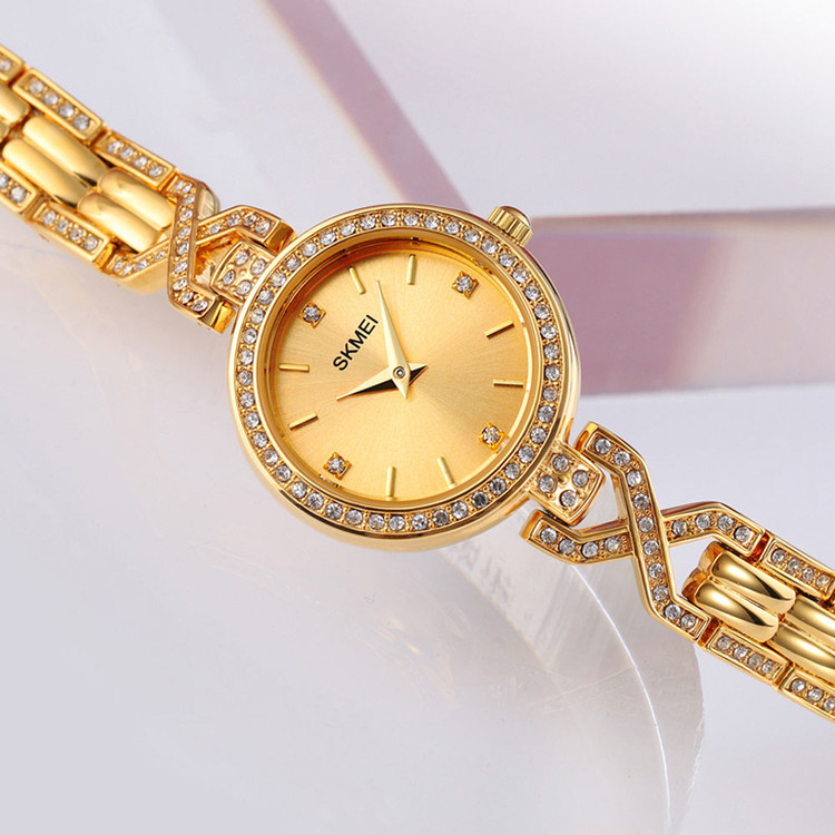 ساعت مچی زنانه اسکمی مدل 1738 یک ساعت ظریف با زیبایی چشم نواز و خیره کننده است. صفحهی ساعت همرنگ با بند آن است و در کنار نگینهای دور صفحه و روی بند، باعث میشود ساعت ظاهر داشته باشد. نگینهای روی بند بسیار ظریف هستند و تا وسط بند امتداد دارند.
