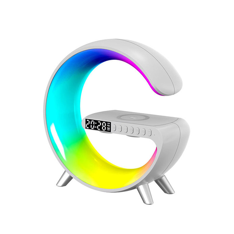 چراغ خواب مدل G یک چراغ خواب بسیار کاربردی مجهز به اسپیکر و شارژر وایرلس است که با توجه به قابلیت نورپردازی RGB و تک رنگ ظاهر زیبایی هم دارد. شما با استفاده از این محصول در کنار تخت خواب، هم یک چراغ خواب زیبا دارید، هم یک ساعت دارید که میتوانید به کمک آن آلارم تنظیم کنید، هم یک اسپیکر دارید که میتوانید موزیک دلخواه خود را پخش کنید تا با آرامش بیشتری بخوابید و هم یک شارژر وایرلس دارید که میتوانید گوشی خود را روی آن قرار دهید تا هنگام خواب شارژ شود.
